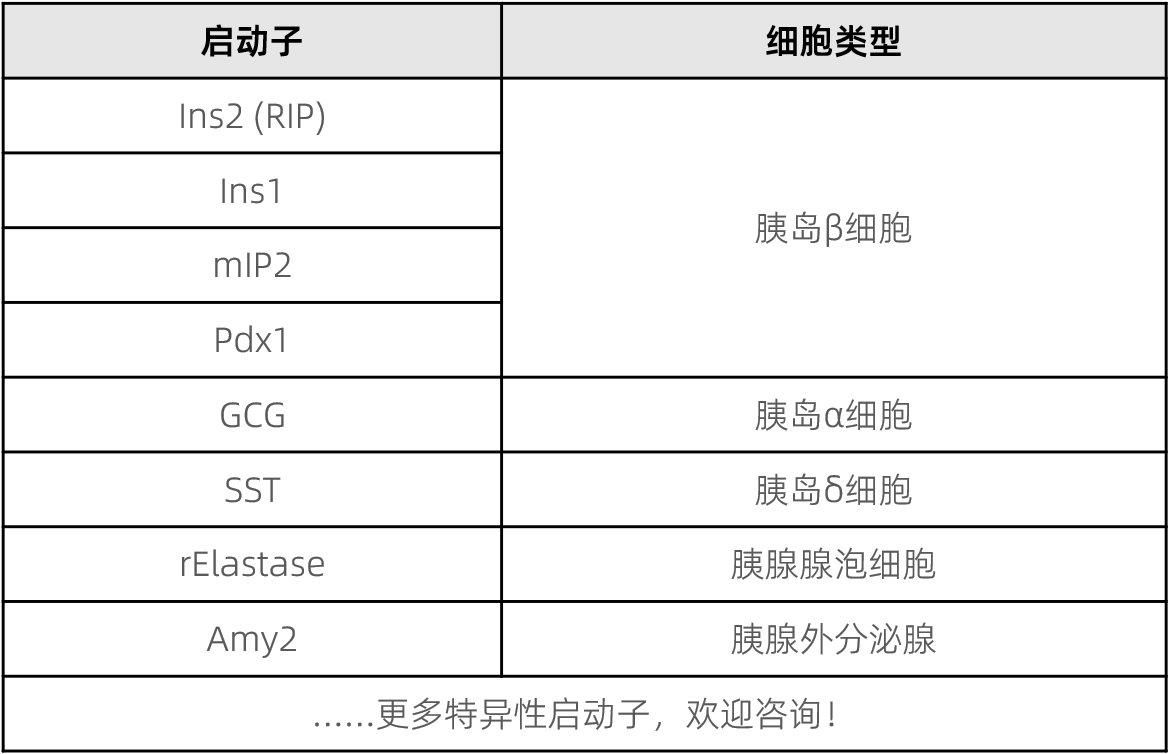 胰腺中的细胞类型复杂多样。为了在特定细胞中选择性表达目的基因,需要根据实验目的不同来选择合适的启动子。如果是在胰腺中广泛表达,可以选择CBh、CMV、CAG等广谱启动子。如果想要特异性靶向胰腺中特定的细胞类型,可以选择对应的细胞特异性启动子。