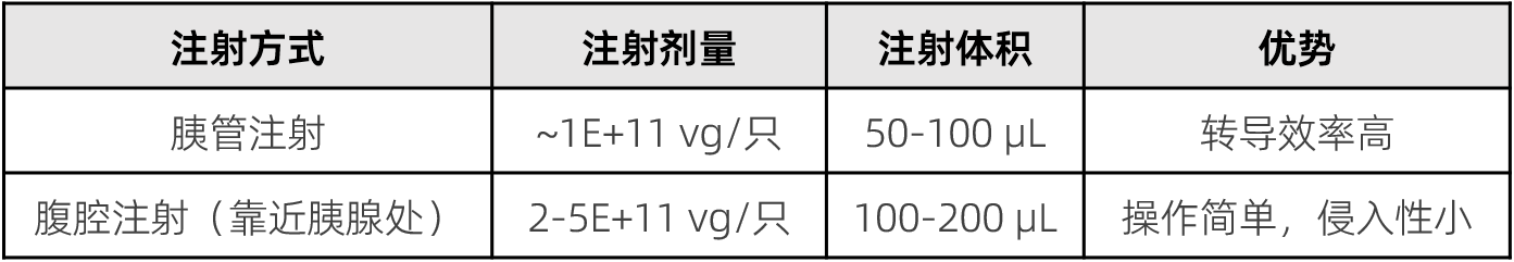 在AAV介导的胰腺基因递送中,最常用到的注射方式是胰管注射和靠近胰腺处腹腔注射。具体的注射方式和注射剂量参考下表。