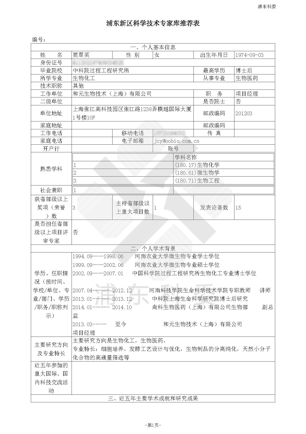 热烈祝贺和元生物的贾翠英博士成为浦东科委专家库成员!