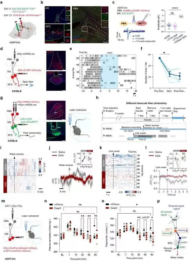 研究团队发现,MS区的GABA能神经元在饮水行为中扮演重要角色。这些神经元在饮水初期被抑制,但随着饮水过程的推进,其活动逐渐增强。通过光遗传学、在体光纤记录、和双光子成像技术,作者发现并验证了激活MS-SFO环路可迅速终止口渴小鼠的饮水行为,而抑制该环路则会诱发正常生理状态下小鼠的饮水行为,且这种调控存在状态依赖性。