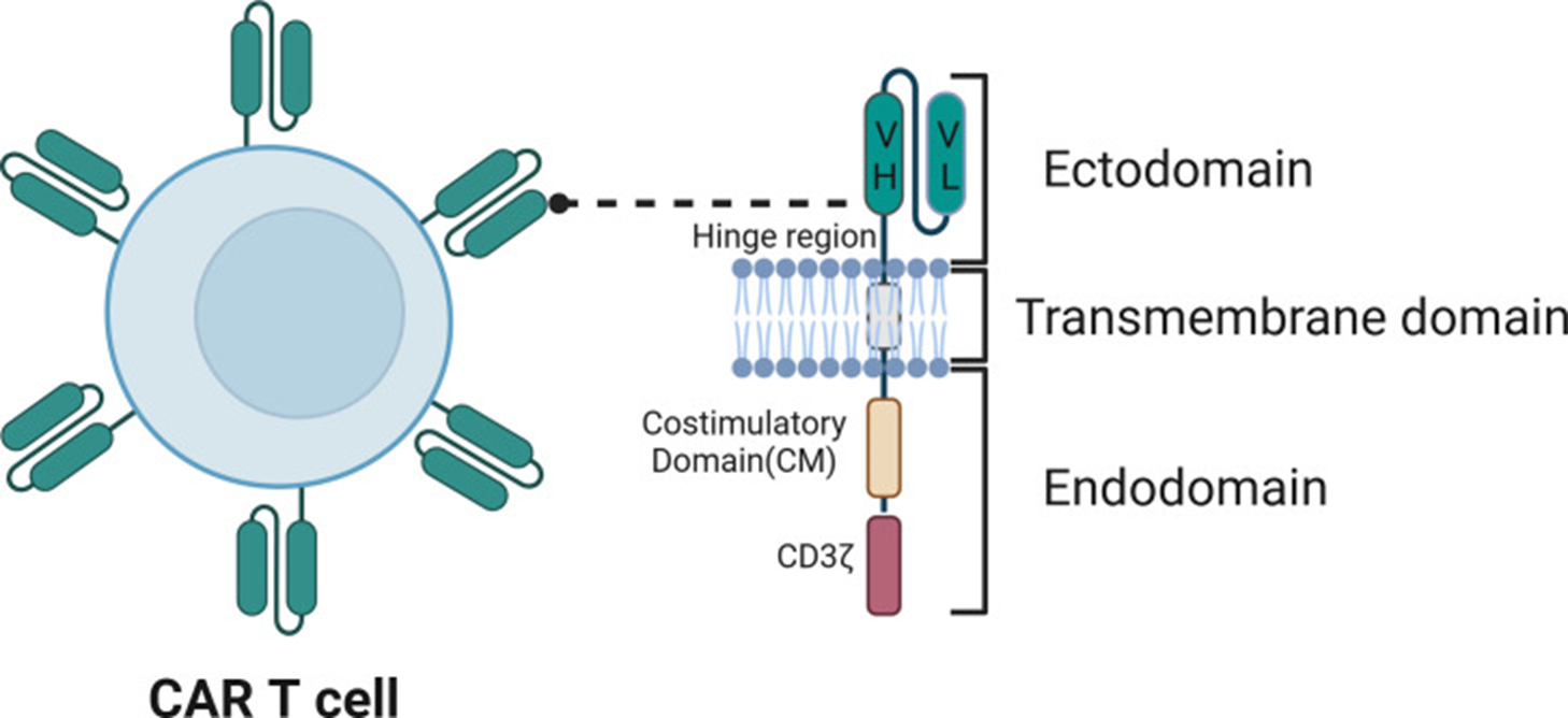 抗原识别结构域由单克隆抗体的可变重链(VH)和轻链(VL)通过连接体连接形成的 ScFv 构成。抗原识别结构域的主要功能是特异性识别靶细胞表面存在的肿瘤相关抗原(TAA),从而促进携带 CAR 的 T 细胞的激活。