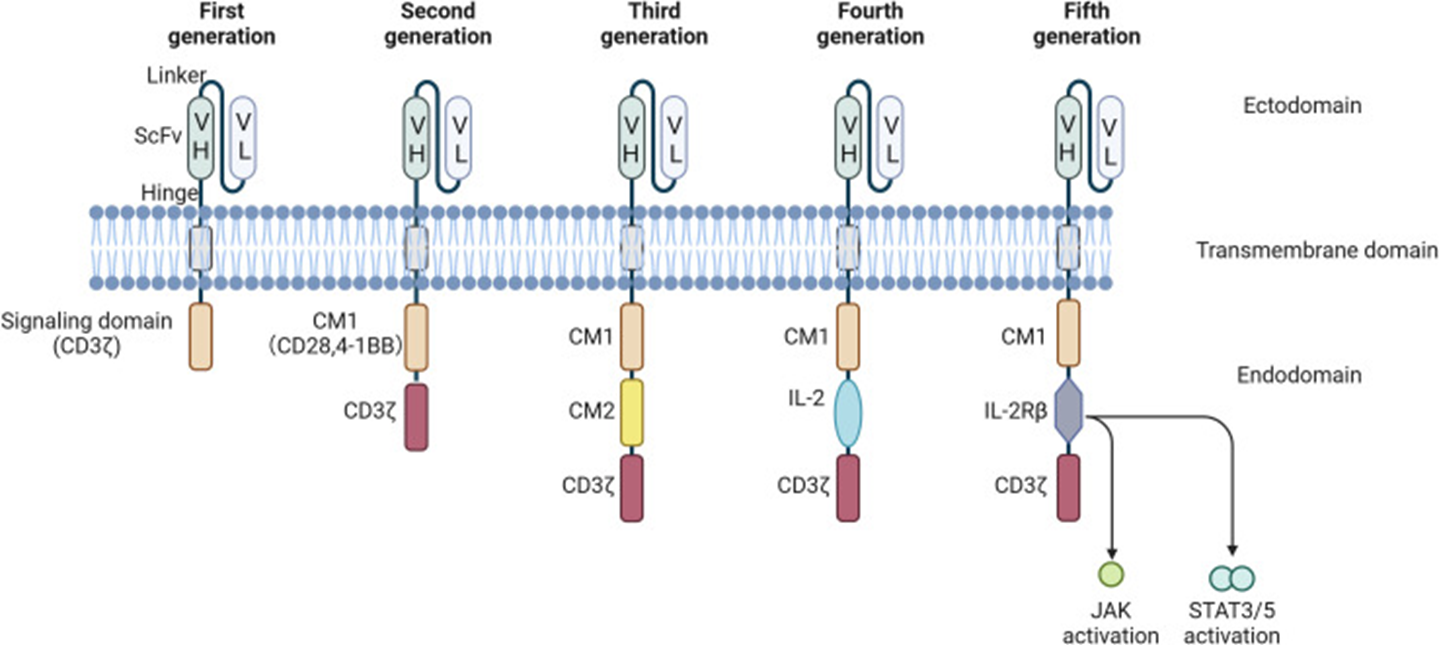 第五代在第二代的基础上,添加细胞质IL-2受体β链(IL-2Rβ)结构域和STAT 3结合片段。激活第五代可促进T细胞受体(TCR)和细胞因子驱动的JAK-STAT信号传导,增强生物工程细胞的增殖和活化T细胞。