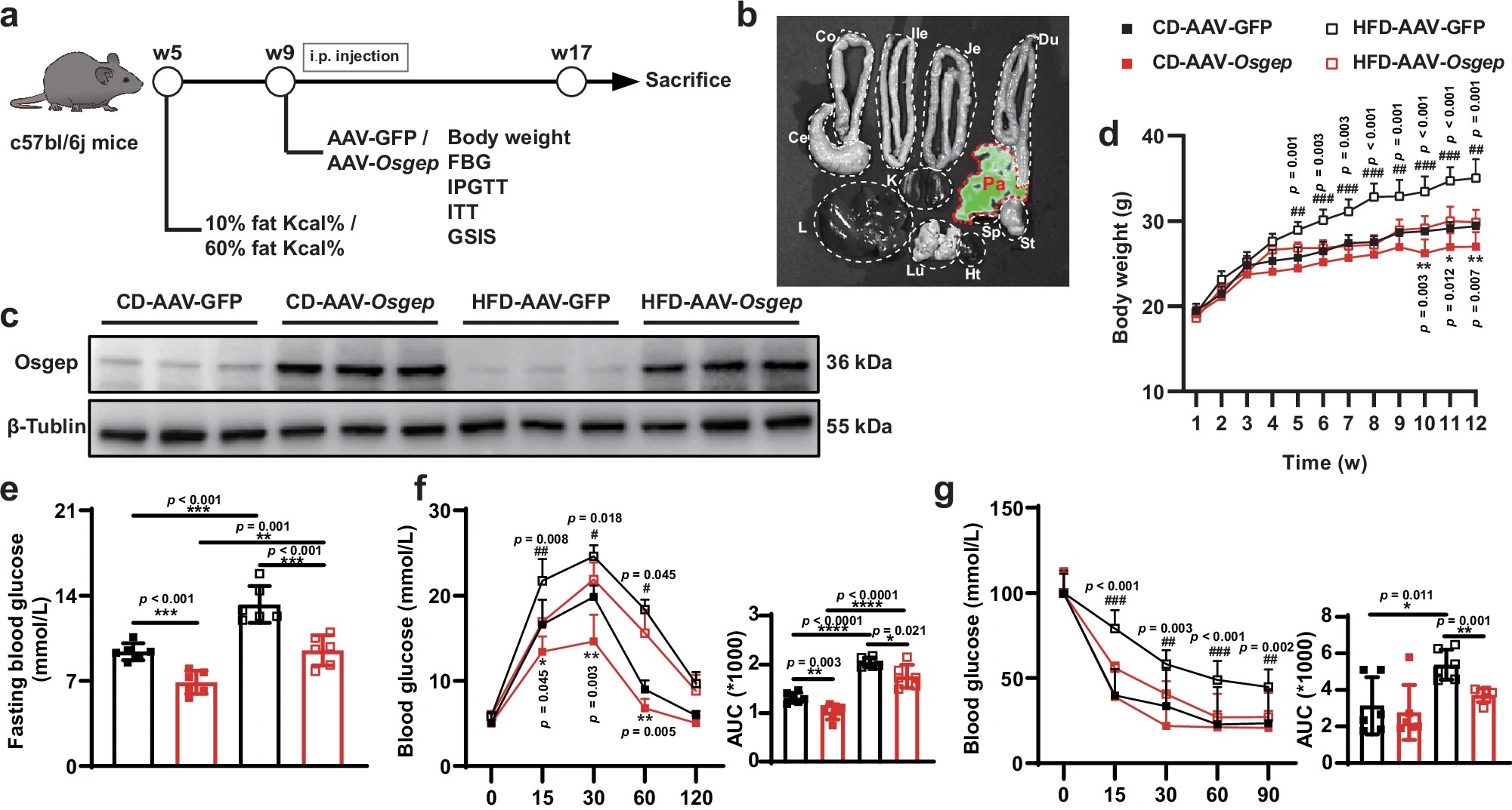 图8 AAV介导的胰腺Osgep过表达改善了HFD小鼠的异常葡萄糖代谢